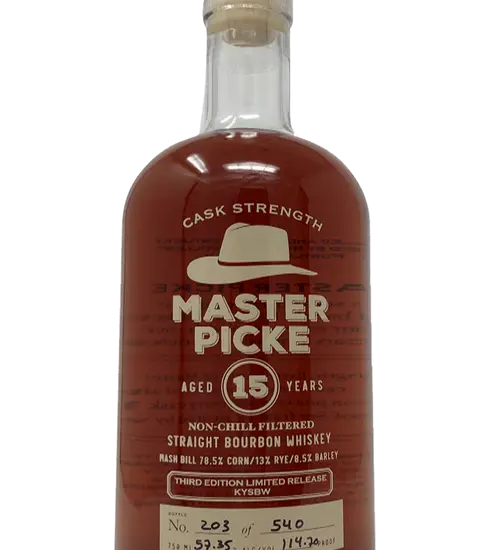 Master Picke 15 Year Old Cask Strength Straight Bourbon Whiskey is a Bourbon Whiskey from Kentucky. It is packaged in a 750ml bottle. Another fine Bourbon Whiskey from Master Picke.