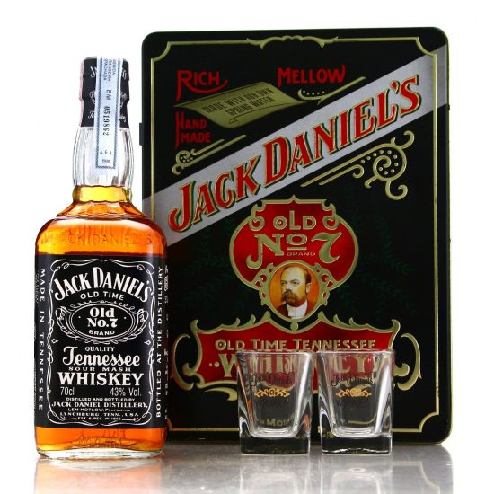 Jack Daniels Old Time Tennessee Tin 2 Glass Gift Set with Old Bottling of No 7 Black Label Whiskey 700ml Bottle